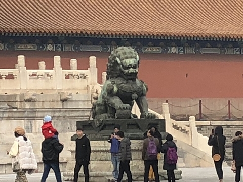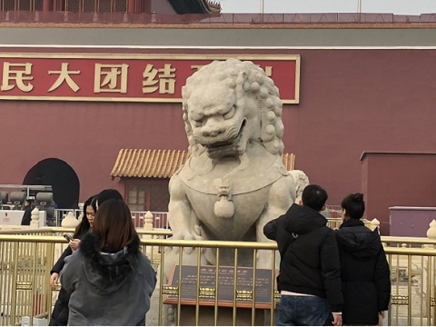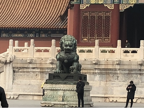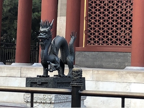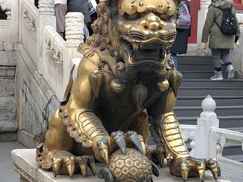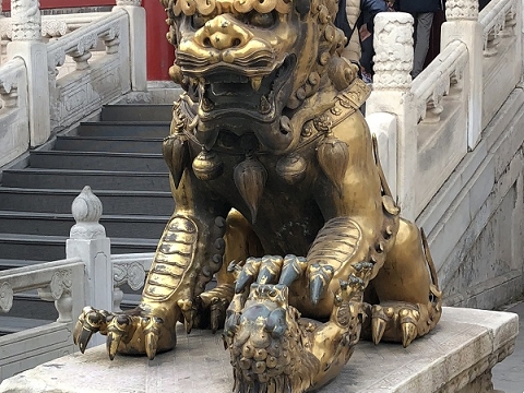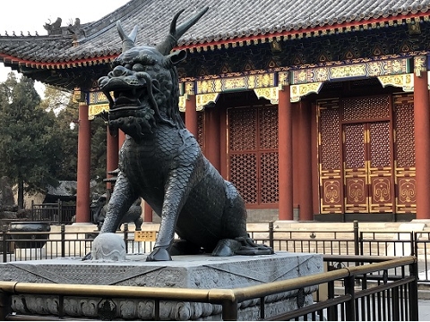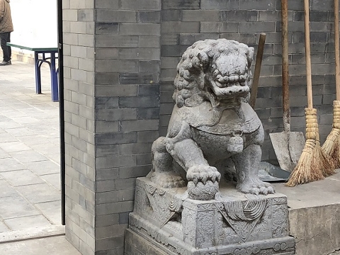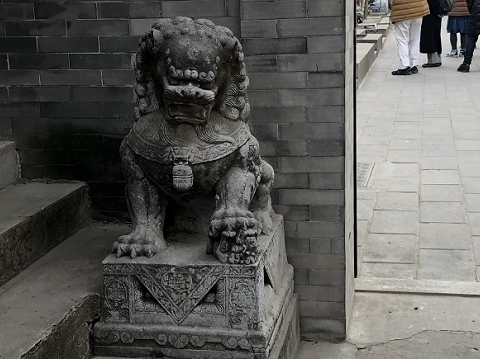 龍の形をした近代的なビルがありました。頭部にIBMとありましたから、先頭のビルはオフィスビルのようですが、胴体と尻尾の部分はマンションだとか、北京一高級な億ションで、官僚や企業のビッグネームが入居しているそうです。銀行や、企業ビル、商店、飲食店など、立派な建物になればなるほど、それに見合った大きさの狛犬が入口に必ず置いてありました。狛犬だけでなく、水の流れ、ビルの向きなどを、考えて設えてあるとのことでした。