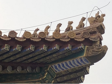 文化財の建物の屋根には、仙人騎鳳と(麒麟、鳳凰、獅子、海馬、天馬、押魚、サンゲイ、カイチ 、斗牛、行什)という 10体の聖獣たちが並んでいます。装飾だけでなく、魔除け、火災除け、雨漏り防止という役割があるそうです。