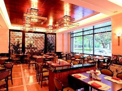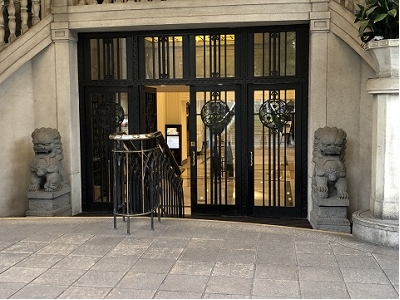 歴史あるホテルで、華やかなりし頃は世界中の著名人が宿泊したようですが、今では近代的なホテルにお役目が移って、このホテルは我々のような旅行客でも気軽に利用できるようになっています。広大な敷地は二つの門で外界から隔てられ、門や敷地内の要所にはガードマンが常駐していて、外部から無用な侵入が出来にくくなっているので安全性はバッチリ。敷地内には「北楼」「貴賓楼」「南楼」の独立した三棟があり、それぞれのエントランスは雰囲気を残すレトロな質感と重厚な老舗ホテルであることを見せていて、クラシックな雰囲気はとても魅力的でした。お約束の風水ですが、エントランスには獅子の置物が一対鎮座しレストランの入り口には7本の柱の上に神獣が並んでいました。建物は車道と美しい花壇で繋がっていて、毎朝の散歩にGoodでした。