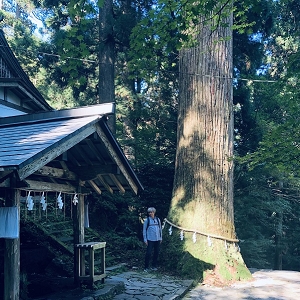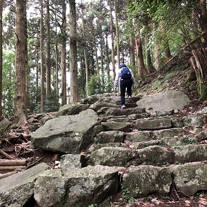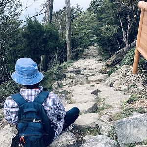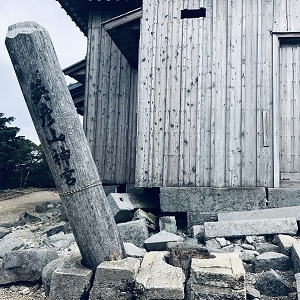 さて、正面登山口からは、途中で普通の登山道になると予測していたのが大きな誤算で、山頂まで石畳と石段だけで造られた参道で、しかも段差が30~40cmという石ばかり、膝はガクガク、心臓はバクバク、「山頂まで行けるのか?」不安がよぎりましたが、「決意」をして来たことを思い、休み休みしながら、ついに上宮までたどり着くことが出来ました。
